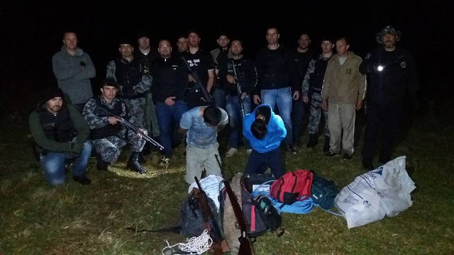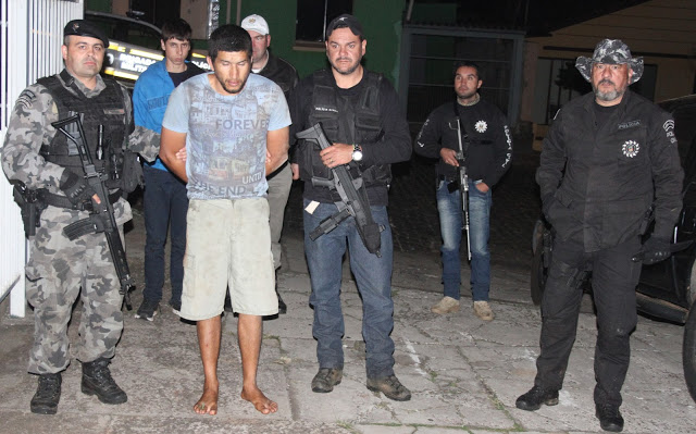 Depois 14 horas de trabalho, policiais civis e militares prenderam Edenir Ribas dos Santos, 34 anos, e Bruno Machado Durante, 18. Também foram apreendidos fuzil 7.62mm., espingarda semiautomática, revólver, munições, toucas ninja e o valor pago para libertação da vítima. (fotos: Polícia Civil e blogue Rafael Nemitz)