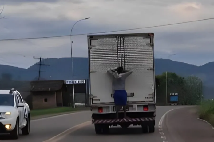 Encantado (RS) – Um homem não identificado foi flagrado nesta quarta-feira (19) pegando “carona” pendurado na área externa de um caminhão-baú na ERS-129.