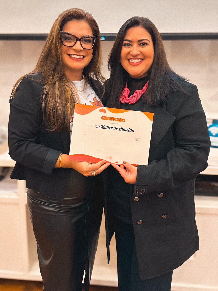 Durante a cerimônia, as diretoras da AME e autoridades presentes entregaram os certificados às formandas, reconhecendo aquelas com 80% e 100% de aproveitamento.