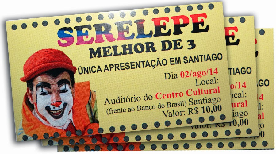 Já estão à venda os ingressos para a apresentação única que a trupe do Teatro Serelepe fará em Santiago, neste sábado, às 20h, no auditório do Centro Cultural. Os ingressos estão à venda na Frescalle, jornal Expresso Ilustrado e Central FM, ao preço de 10 reais.