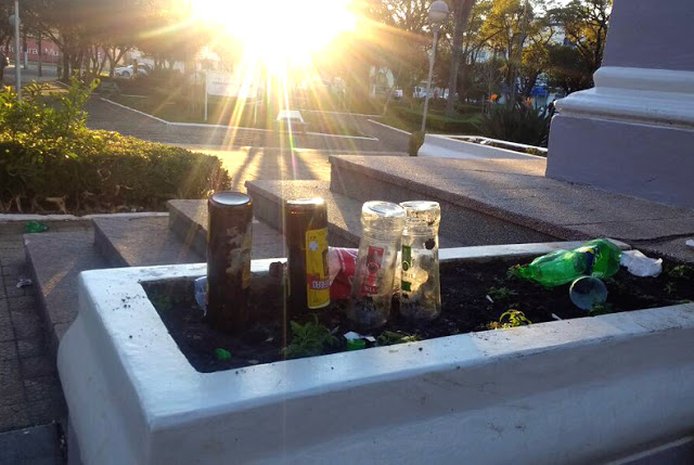 da santa na praça ) amanheceram com várias garrafas no lugar das mudas, além outras