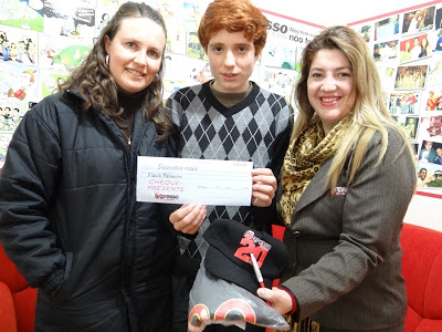 O filho do Pedro e da Mariana Palmeiro fez sucesso na festa junina do Círculo Militar ao vencer o Soletrando com o Expresso. Tudo indica que o jovem Flávio Cayê Palmeiro, de apenas 13 anos, vai muito longe, pois desde cedo já se dava bem com raiz quadrada e outros cálculos. E na escrita, então, sempre foi nota 10. Hoje ele esteve na redação pra buscar seus prêmios, em brindes e em dinheiro. Também ganhou mais uma assinatura do jornal, já que era só o pai quem recebia em seu trabalho. Ele ainda não sabe que profissão terá no futuro, mas presumimos que ele não será pouca coisa para o orgulho do avô Barbela e dos colegas da escola Lucas Araújo.