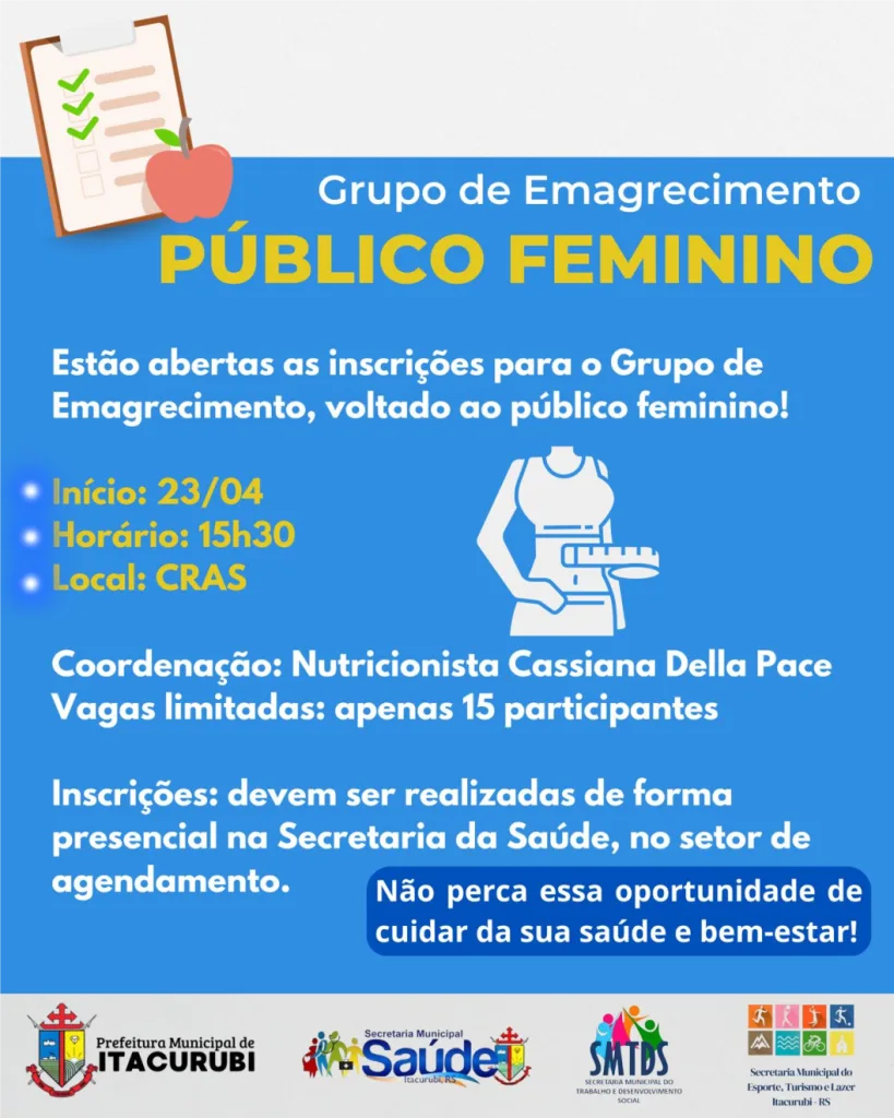 Itacurubi – RS – Estão abertas as inscrições para o Grupo de Emagrecimento voltado ao público feminino em Itacurubi. A iniciativa busca promover saúde, bem-estar e qualidade de vida por meio de acompanhamento profissional.