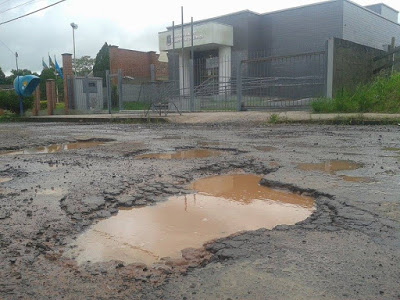 E em São Vicente, há horas a cidade está virada em buracos. Nem a frente à Promotoria escapa. Esta rua também é a principal ligação com o Instituto Farroupilha. Há até uma aposta correndo de boca em boca pra ver quem consegue passar sem cair num buraco. Dizem que nem de moto é possível tal façanha.