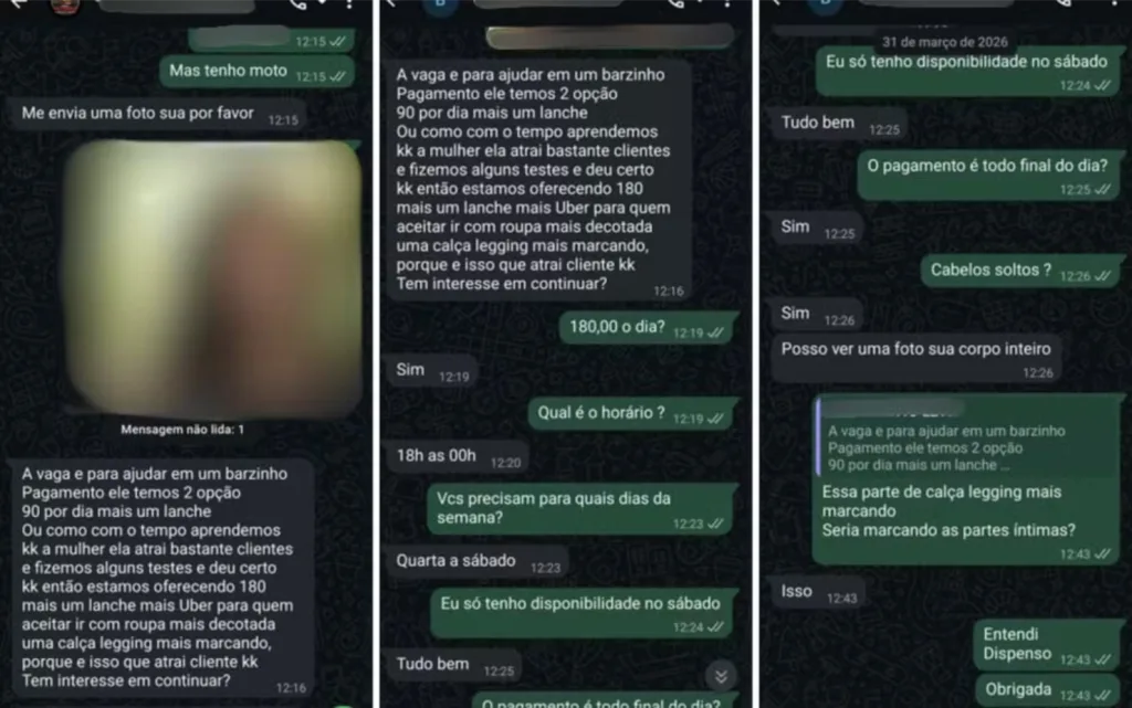 A conversa mostra que ela ainda perguntou se a exigência era para evidenciar partes íntimas e recebeu confirmação. O caso ocorreu há cerca de duas semanas. A vaga foi divulgada em grupo de WhatsApp e oferecia pagamento entre 90 e 180 por turno, conforme as condições aceitas.
