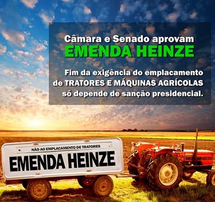 O deputado federal Luiz Carlos Heinze comemorou a aprovação de uma emenda de sua autoria pondo fim ao emplacamento de máquinas e tratores agrícolas. A proposta passou pelo Congresso e Senado, para a satisfação dos produtores rurais de todo o país. Heinze comemorou divulgando a imagem acima nas redes sociais. Para ele poder marcar definitivamente um gol de placa, seu projeto de lei só precisa da aprovação da presidente Dilma.