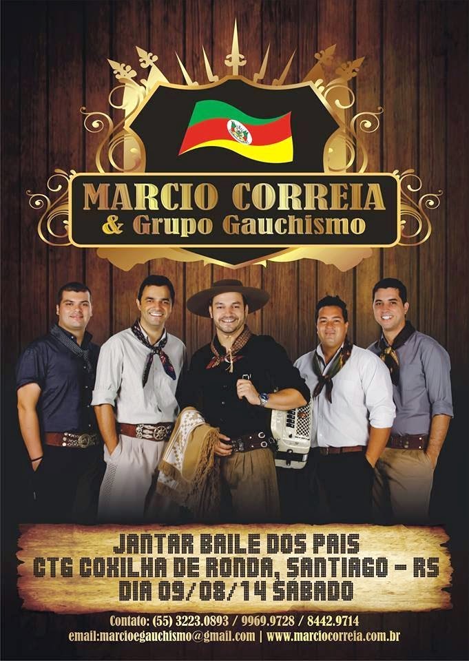 Neste sábado, 09 de agosto, o CTG Coxilha de Ronda traz Márcio Correia & Grupo Gauchismo para animar o jantar-baile em homenagem aos pais. O evento será a partir das 20h e os cartões estão à venda na secretária.