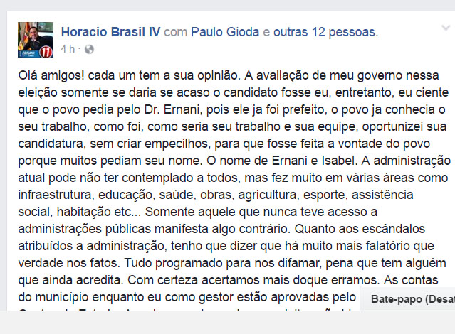 “A avaliação de meu governo nessa eleição somente se daria se acaso o candidato fosse eu, entretanto, eu ciente que o povo pedia pelo Dr. Ernani, pois ele ja foi prefeito, o povo já conhecia o seu trabalho, como foi, como seria seu trabalho e sua equipe, oportunizei sua candidatura, sem criar empecilhos, para que fosse feita a vontade do povo porque muitos pediam seu nome”…