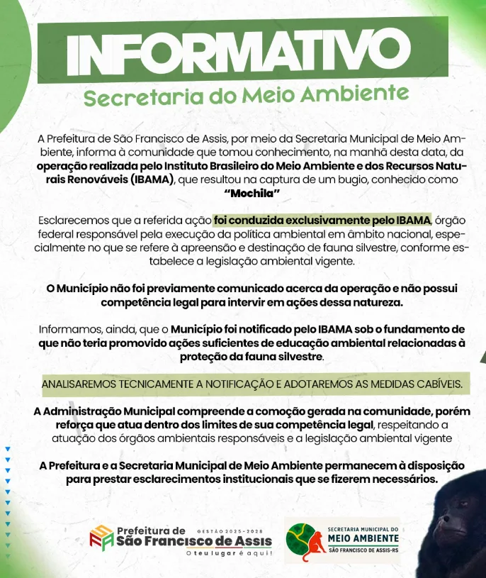 São Francisco de Assis – RS – (Região de Santiago) – A apreensão do bugio conhecido como Mochila dividiu a comunidade. O animal foi recolhido pelo Ibama após denúncias de que estaria causando transtornos. Parte da população culpa a prefeitura, mas o Município divulgou nota afirmando que a operação foi conduzida exclusivamente pelo IBAMA e que não teve participação na ação.