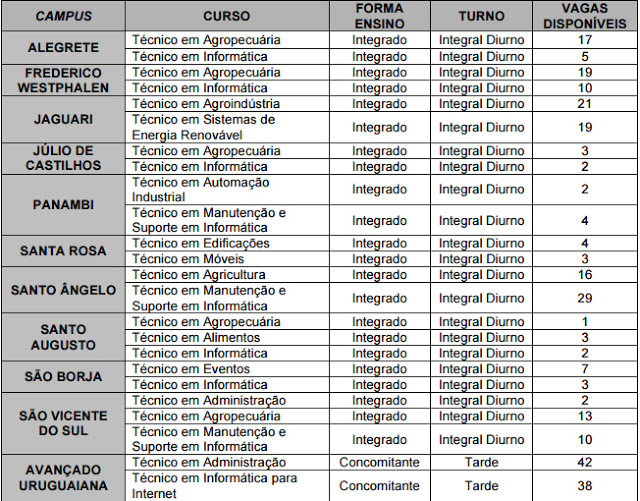 O Instituto Federal de Educação, Ciência e Tecnologia Farroupilha abre 275 vagas remanescentes nos cursos técnicos de nível médio integrados e concomitantes. Há vagas no de Alegrete, Frederico Westphalen, Jaguari, Júlio de Castilhos, Panambi, Santa Rosa, Santo Ângelo, Santo Augusto, São Borja, São Vicente e Uruguaiana.