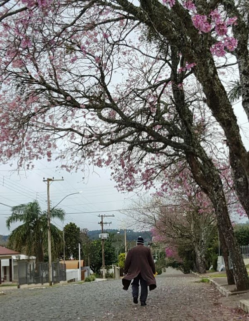 Esta é minha rua (Benjamin), esta é minha Santiago e esses ipês são nossas riquezas. O cenário não é típico da época, pois estamos em pleno inverno, portanto, não é hora para os ipês estarem assim, tão enfeitados. E hoje o dia ainda está todo “enfarruscado”, bem a cara do agosto velho de guerra. Só os ipês que dizem outra coisa; dizem que o frio se foi, que o inverno se foi…