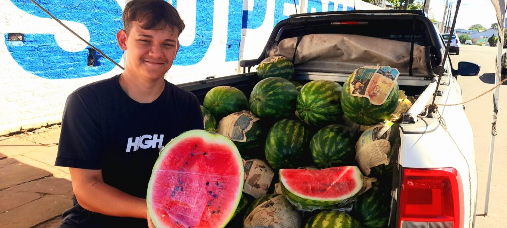 As melancias são vendidas diariamente na rua Bento Gonçalves, esquina do Colégio Cândido Genro. Por ser produção própria, os preços também são mais atrativos. Encomendas pelo telefone 9 9605-4980.