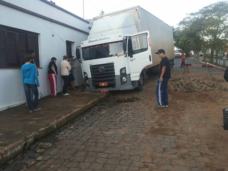Jaguari precisa se benzer, diz Júnior Pereira dos Santos ao publicar esta foto. O caminhão se desgovernou e subiu a calçada. Desta vez, como das outras, sem feridos graves. Há pouco tempo outro caminhão desceu a avenida principal e bateu em vários carros. No domingo a ponte caiu com o peso de outro caminhão… Realmente, Jaguari está ficando perigosa.
