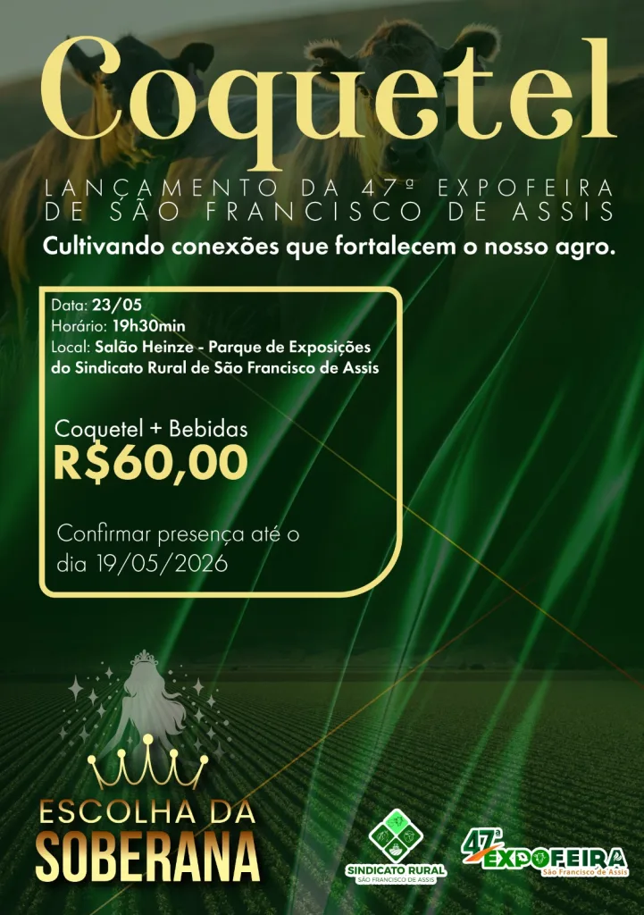 São Francisco de Assis, RS – O Sindicato Rural de São Francisco de Assis organiza o lançamento da 47ª Expofeira com uma noite de encontro entre produtores, lideranças e a comunidade. O evento será no dia 23 de maio, às 19h30, no Salão Heinze, no Parque de Exposições.