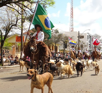 Santiago – Em 2014 o santiaguense Orlando da Silva (Cabeludo) chamou a atenção do público quando foi pra avenida montado em sua mula, comprada especialmente para o 20 de Setembro e com mais de 40 cachorros. Neste ano a cena se repetiu. Além da cachorrada, também chamou a atenção uma ovelha caracterizada especialmente para o desfile com direito a chapéu, lenço e uma faixa com a seguinte mensagem: “Somos todos gaúchos”.