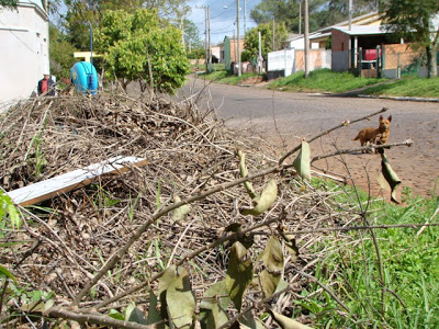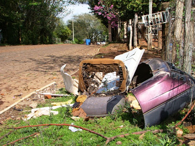 Alguém aí perdeu a metade de um carro roxo? Pois é. Ele está jogado na rua Zico Almeida, juntamente com parte de uma geladeira e poltrona de carro. Mais adiante, existe um amontoado de galhos.