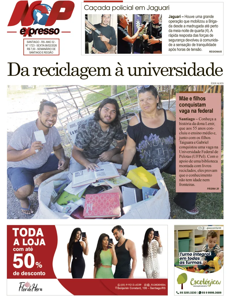 Santiago, RS – O sonho de dona Lenir Medeiros Marques (55 anos) era concluir o Ensino Médio. Esse objetivo foi alcançado no ano passado, na escola Cristóvão Pereira, ao lado de seu filho, Taiguara Medeiros Sousa (29). O outro filho, Gabriel Medeiros Sousa (25), já havia concluído os estudos anteriormente.
