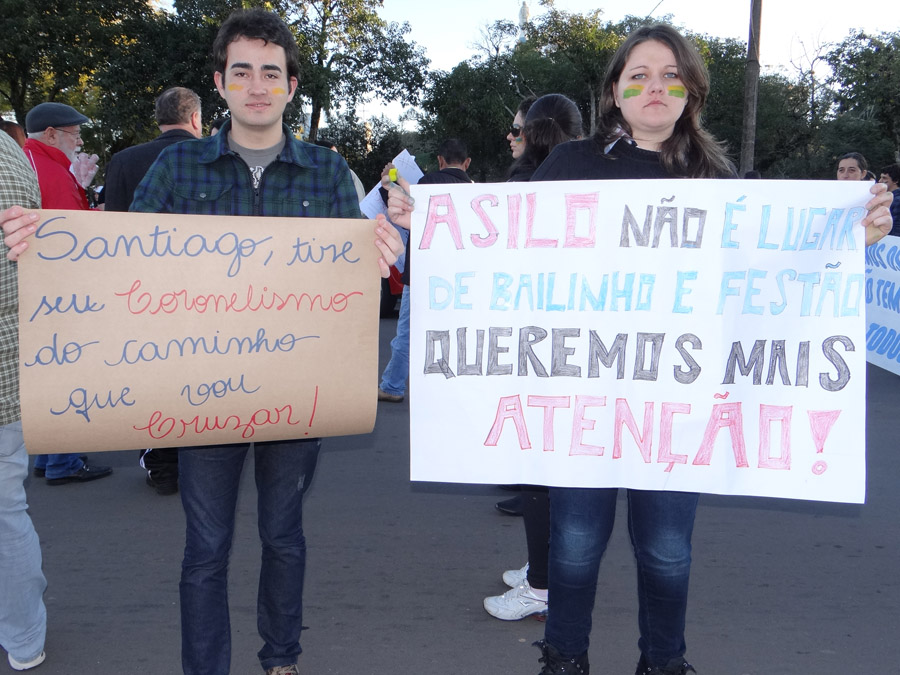 Na frente de suas casas ou na sacada de seus apartamentos, as pessoas aplaudiam e incentivavam os participantes. A maioria das críticas foi direcionada aos serviços de saúde, fazendo até referência aos escândalos das adoções ilegais, pedidos de valorização dos funcionários públicos municipais, críticas à falta de vontade política de trazer uma universidade pública para Santiago, mais investimentos em educação e cultura e muitos outros. Todo o percurso foi acompanhado de perto pela Brigada Militar, que estava à postos para garantir a segurança. Clique na imagem acima para ver mais.