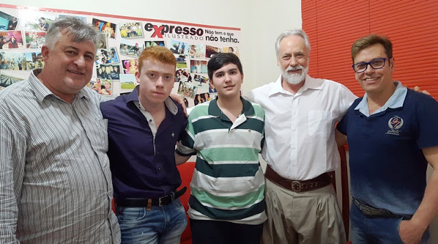 Não é todo dia que a gente recebe gaúchos da marca do Mano Lima, artista regional que agrada a todas as idades, principalmente ao jovem. Mano veio a Santiago a convite da URI para lançar o Vestibular de Verão/2017. Com ele estavam seu filho Pedro, que é acadêmico; seu afilhado Breno e o amigo Miguel Garaialdi – advogado e ex-professor da URI.