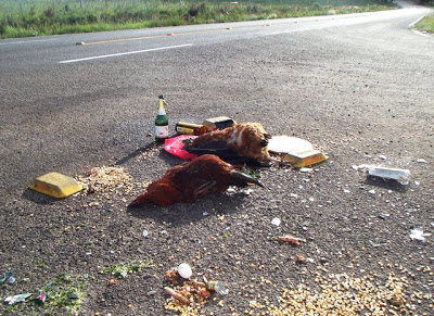 Enquanto milhares de pessoas passam fome, ainda tem este tipo de gente que prefere esbanjar dinheiro com despachos nas encruzilhadas, como este colocado no trevo de entrada da cidade. Caso estas duas galinhas gordas fossem feitas com arroz ou com polenta, seriam bem mais aproveitadas e certamente matariam a fome de pelo menos duas famílias.