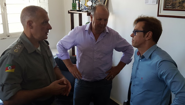 Em seguida, o prefeito Bruning o desmentiu ao dizer que são os assaltantes são amadores, pois vieram com o mesmo carro e nem pneu tinham para ir embora, tanto, que até pegaram uma roda do carro de uma servidora da prefeitura. (Na Foto: major Franco, prefeito Bruning e João Lemes)