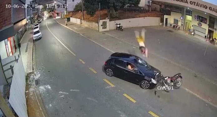 São Roque do Canaã – ES – Na noite do último domingo (6), ocorreu um acidente envolvendo um motociclista e um carro. Imagens de câmeras de segurança mostram o momento exato em que o motociclista colide frontalmente com um veículo que vinha na direção contrária.