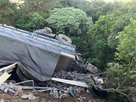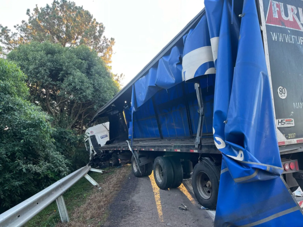 Uma carreta bitrem com placas de Santa Catarina, que estava carregada com paralelepípedos, bateu de frente em outra carreta, que estava vazia, com placas de Uruguaiana.