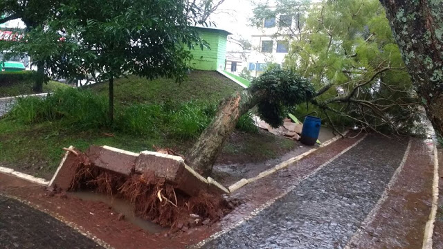 Choveu muito em Santiago desde a tarde de quarta (7). Conforme o Instituto Nacional de Meteorologia o acumulado até as 3h da madrugada chegou a 86 mm. A combinação de terra encharcada e um ventinho é o suficiente pra derrubar algumas árvores. Como aconteceu na praça Moisés Viana, onde uma árvore interrompeu temporariamente a entrada do banheiro público. Pouco depois das 9h, uma equipe da secretaria de Obras fez a remoção.
