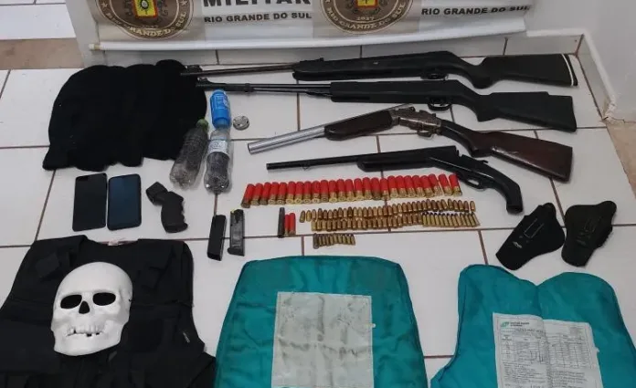 Os policiais encontraram e apreenderam quatro espingardas, duas placas balísticas, vários tipos de munição, dois carregadores de pistola, três coldres, uma máscara e dois celulares.