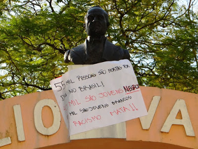 Nota do site: o protesto é válido e, felizmente, não teve dano ao patrimônio público. Mas, a informação no cartaz não condiz com a realidade: se morressem 55 mil jovens por dia, seriam mais de 20 milhões de mortes por ano. Considerando que menos da metade da população brasileira está nesta faixa etária, em três ou quatro anos os jovens seriam exterminados do país.