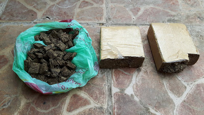 | Soldado e policial examinam o local da droga |
