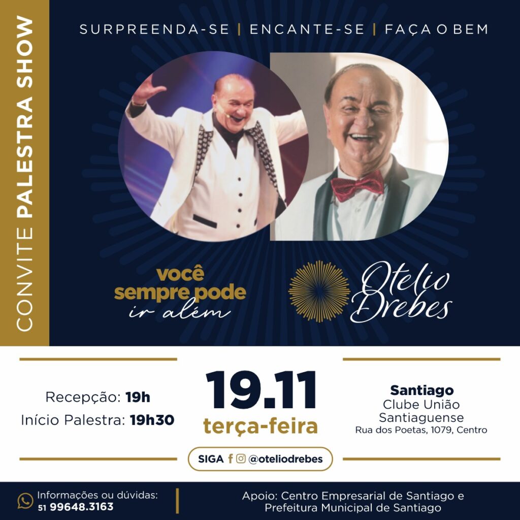 O empresário Otávio Drebs, fundador das lojas Lebes, fará uma palestra-show no Clube União na próxima terça-feira (19), às 19h. O evento é gratuito e terá jantar de cortesia. Interessados devem se inscrever pelo site www.oteliodrebes.com.br.