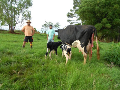 Em Capão do Cipó, o pecuarista Giovane dos Santos Farias, do Assentamento Santa Rita, comemora o nascimento dos primeiros terneiros do programa de inseminação artificial “Dissemina”, do Governo do Estado. Sua vaca de raça holandesa pariu normalmente dois terneiros machos, filhos do touro americano Ruan Rudolph Nova, da raça holandesa, pertencente ao banco de sêmen do Programa Dissemina.