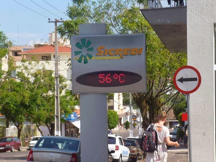 Obs. O Expresso já constatou; estes termômetros de rua não são confiáveis, a não ser que ficassem protegidos do sol e do vento gelado (no inverno). Portanto, não se iludam. Lógico que o calor é alto, em São Borja fez 38 e 42 noutra região do Estado (marcas oficiais), mas 56 ainda não fez em lugar nenhum.