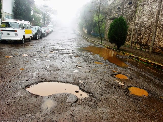 Quem chega à cidade pela Redênzio Frizzo tem que escolher o menor dos buracos da rua para passar. Tudo porque a buraqueira tomou conta da quadra em frente ao curtume. Em dias de chuva o problema fica pior por que a boca-de-lobo não dá conta e os buracos acabam encobertos.