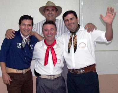 Júlio Saldanha e Édson Vargas, dois grandes artistas da nossa terra em mais uma confraternização. Entre eles, o Fernandinho (Mateadores) e o Vagner Silveira, um dos gaúchos que lidera a equipe do CTG Coxilha de Ronda com toda sua capacidade e simpatia.