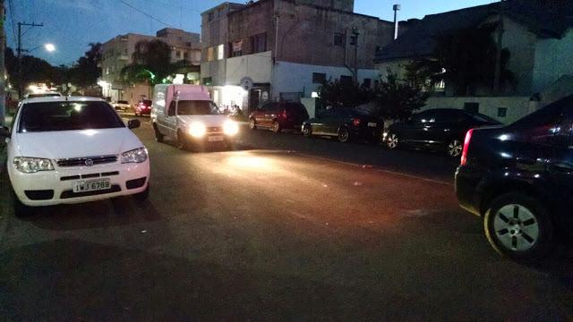 Santiago – Falando em estacionamento, lanço uma pergunta: não deveria ser proibido estacionar neste trecho da Sete de Setembro? Essa foto, enviada por um leitor terça à noite, mostra a realidade perto de uma sorveteria. O problema é que ali, ainda há veículos que param na pista para dobrar à esquerda ou à direita na Bento, onde a pista se divide em três (frente à loja Claraboia).