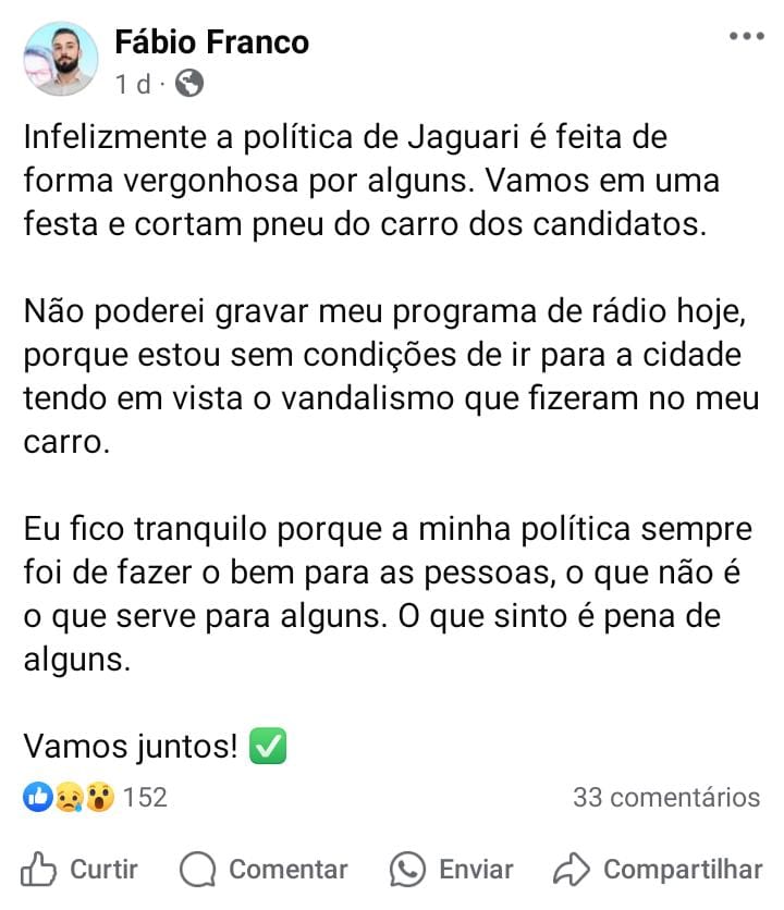 Franco está concorrendo novamente a vereador e fez uma postagem em suas redes sociais, lamentando o ocorrido e mostrando a sua indignação.