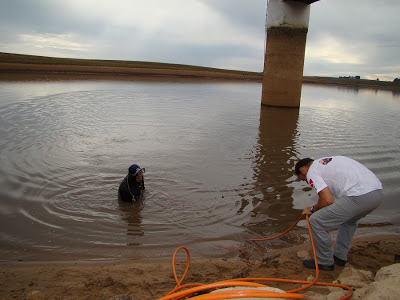 Na tarde deste sábado, uma equipe de mergulhadores veio de Porto Alegre para verificar o nível da última comporta de água da barragem, que é uma reserva emergencial e que nunca foi aberta em mais de 40 anos. Conforme Rubem Lima, gerente da Corsan, a medição feita pelo mergulhador apontou que o que temos são 4 metros de água (o total da barragem quando cheia é de 14 metros), confirmando que a barragem poderá resistir só mais uns três meses se a falta de chuva persistir. E, claro, ele reafirmou que mais do que nunca as pessoas precisam economizar água potável.