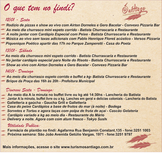 Geral InícioGeral O que tem no findi em Santiago? Publicado em 15/06/2018 POR NP Expresso FacebookTwitterWhatsAppLinkedinTelegram DEIXE UMA RESPOSTA Cancelar resposta Comentário: Por favor digite seu comentário! Nome:* Por favor, digite seu nome aqui E-mail:* Você digitou um endereço de e-mail incorreto! Por favor, digite seu endereço de e-mail aqui Site: Salve meu nome, e-mail e site neste navegador para a próxima vez que eu comentar. Siga o NP Expresso 184.758 132,618FãsCurtir 73,451SeguidoresSeguir Notícias Recentes Estado Produtores conseguem suspender cobrança de royalties da soja São Vicente do Sul, RS - Três produtores rurais conseguiram na Justiça suspender a... 24/03/2026 Nacional Jovem esfaqueia namorado e diz que agiu em legítima defesa Maceió, Alagoas - Bia Correia, de 21 anos, feriu o namorado, de 22, com... 24/03/2026 Geral Projeto Taifa descobre novos talentos da música Santiago - RS - (Região do Vale do Jaguari) - O sonho de transformar... 24/03/2026 Geral Mentoria com Quésia Vieira no Chuva de Ideias na reta final de inscrições Santiago, RS - A mentora Quésia Vieira será a responsável por conduzir a próxima... 24/03/2026 Leia Também Estado Produtores conseguem suspender cobrança de royalties da soja São Vicente do Sul, RS - Três produtores rurais conseguiram na Justiça suspender a... 24/03/2026 Nacional Jovem esfaqueia namorado e diz que agiu em legítima defesa Maceió, Alagoas - Bia Correia, de 21 anos, feriu o namorado, de 22, com... 24/03/2026 Geral Projeto Taifa descobre novos talentos da música Santiago - RS - (Região do Vale do Jaguari) - O sonho de transformar... 24/03/2026 VER TODAS AS NOTÍCIAS