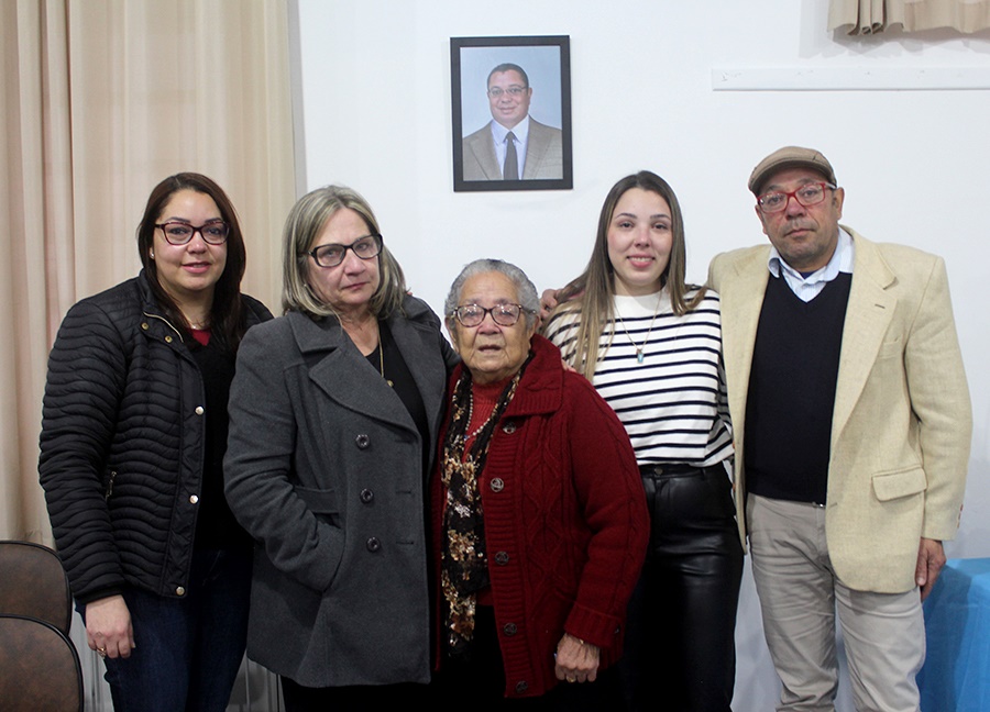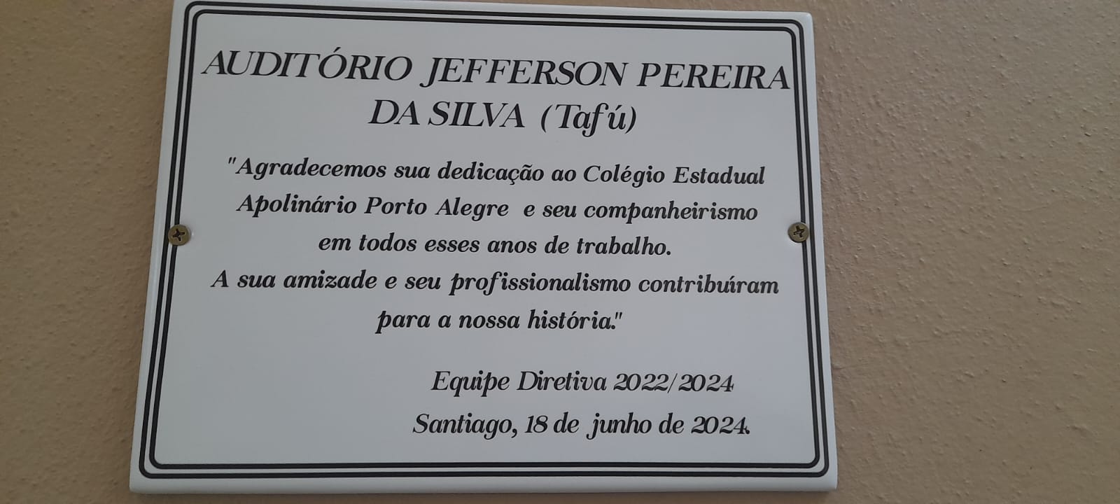 Santiago – Direção, professores, funcionários e alunos se reuniram na tarde desta terça-feira (25/6) para uma justa homenagem a quem tanto fez pelo colégio Apolinário Porto Alegre. Em um momento marcado pela emoção, auditório foi batizado de Jeferson Pereira da Silva (Tafu). Familiares do ex-servidor homenageado, ex-colegas e convidados também se fizeram presentes. O descerramento da fotografia foi feito pela mãe, dona Creci Pereira da Silva.