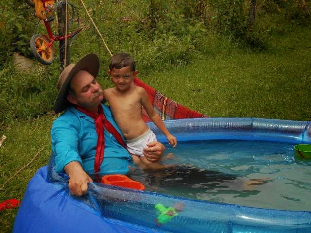 nada melhor que se refrescar na piscina. Só que ele não tirou suas pilchas pra