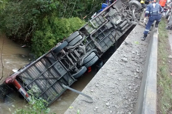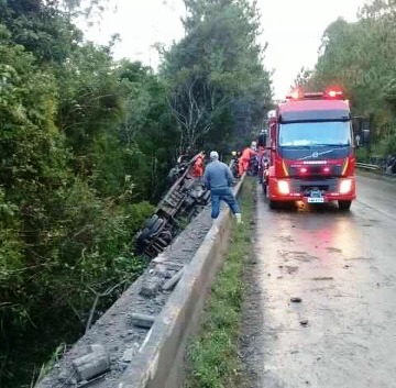Causas – O motorista não teria vencido uma curva na localidade de Passa Sete e acabou tombando. O ônibus destruiu a mureta e caiu com as rodas para cima.
