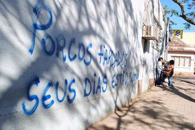 Geral InícioGeral Os pichadores voltaram Publicado em 30/11/2015 POR NP Expresso FacebookTwitterWhatsAppLinkedinTelegram Santiago – Depois de uma pausa no dano ao patrimônio público e particular, os pichadores da madrugada voltaram a agir no centro. Desta vez, deixaram sua marca na lateral do Banco do Brasil, dando um recado aos policiais e contra o sistema bancário. DEIXE UMA RESPOSTA Cancelar resposta Comentário: Por favor digite seu comentário! Nome:* Por favor, digite seu nome aqui E-mail:* Você digitou um endereço de e-mail incorreto! Por favor, digite seu endereço de e-mail aqui Site: Salve meu nome, e-mail e site neste navegador para a próxima vez que eu comentar. Siga o NP Expresso 184.758 132,618FãsCurtir 73,451SeguidoresSeguir Notícias Recentes Estado Progressistas marcam data para receber novos deputados Estado - RS - A direção do Progressistas prepara um ato no dia 26... 20/03/2026 Estado Exumação de bebê reacende dúvidas sobre morte em Triunfo Triunfo (Região de Porto Alegre), RS - Esdra Ravi Palmeira Rodrigues, de 6 meses,... 20/03/2026 Nacional A exclusividade da fabricante terminou e 13 novos pedidos já estão na fila da Anvisa Geral - O mercado de remédios para emagrecer sofreu uma mudança importante nesta sexta-feira... 20/03/2026 Estado A criança caminhou ferida para pedir socorro Caxias do Sul, RS - Uma mulher recebeu a pena de 66 anos de... 20/03/2026 Leia Também Estado Progressistas marcam data para receber novos deputados Estado - RS - A direção do Progressistas prepara um ato no dia 26... 20/03/2026 Estado Exumação de bebê reacende dúvidas sobre morte em Triunfo Triunfo (Região de Porto Alegre), RS - Esdra Ravi Palmeira Rodrigues, de 6 meses,... 20/03/2026 Nacional A exclusividade da fabricante terminou e 13 novos pedidos já estão na fila da Anvisa Geral - O mercado de remédios para emagrecer sofreu uma mudança importante nesta sexta-feira... 20/03/2026 VER TODAS AS NOTÍCIAS
