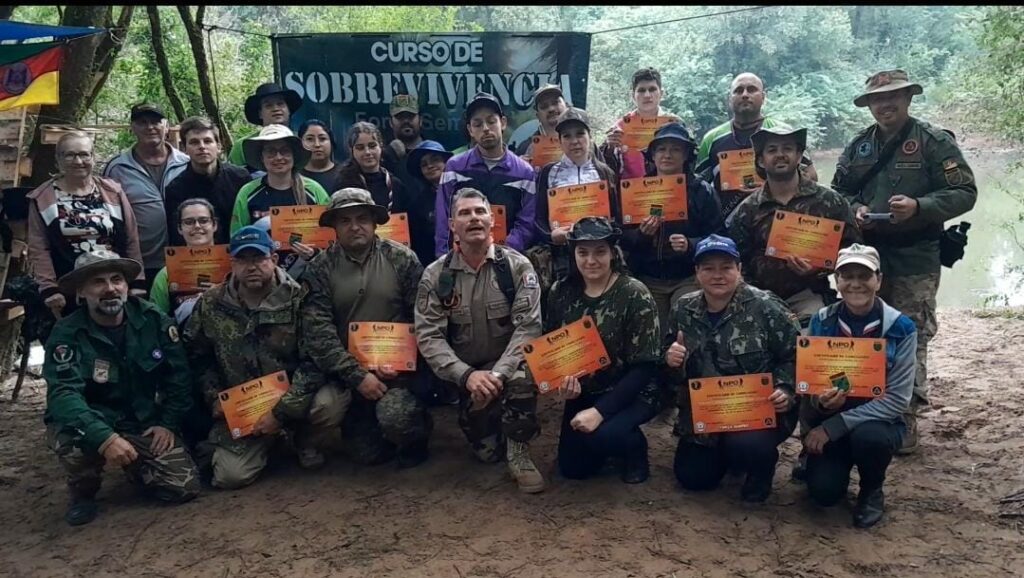Neste final de semana, mais de 20 participantes encararam o desafio promovido pela sobrevivência. A NPO Treinamentos, empreendimento do casal Paulo Acosta e Natália Rockembach, recebeu a todos numa área de mata atlântica, onde aprenderam diversas técnicas: como montar abrigo, criar fogo primitivo, identificar espécies, criar nós e amarras, realizar salvamentos e muitas outras técnicas.