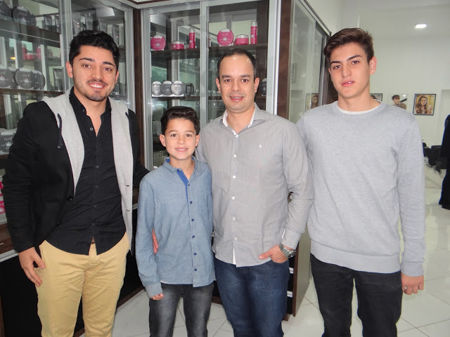 | João ganhou uma linda camisa patrocinada pela Don Luigi. Na foto, pai e filho com a gerente Cristiane Flores. |