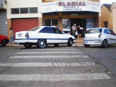 Isso já é comum em Santiago, como vemos aí na foto, em frente à padaria Glacial. O cara coloca este lindo carrão em cima da faixa e desce bem faceiro, sem drama nenhum na consciência. Caso a lei estivesse ali e o multasse, garanto que iria reclamar… Mas é só assim mesmo!