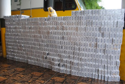 Dois motoristas de Livramento e uma caroneira foram detidos pela Polícia Rodoviária Estadual de Santiago nesta quinta com mil e 500 pacotes de cigarro paraguaio que vinha de Santa Rosa rumo à cidade dos envolvidos. Os donos e a carga foram levados à Polícia Federal de São Borja para o registro. (foto: Éder Alves).