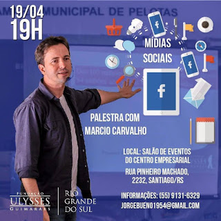Santiago – Nesta terça (19), acontece no salão de eventos do CES uma palestra com Marcio Carvalho sobre Mídias Sociais. O palestre dará dicas de como trabalhar com as redes sociais e alcançar seus objetivos. O evento é gratuito é não precisa fazer inscrições. Ele começa às 19h e os participantes ganharão certificado.