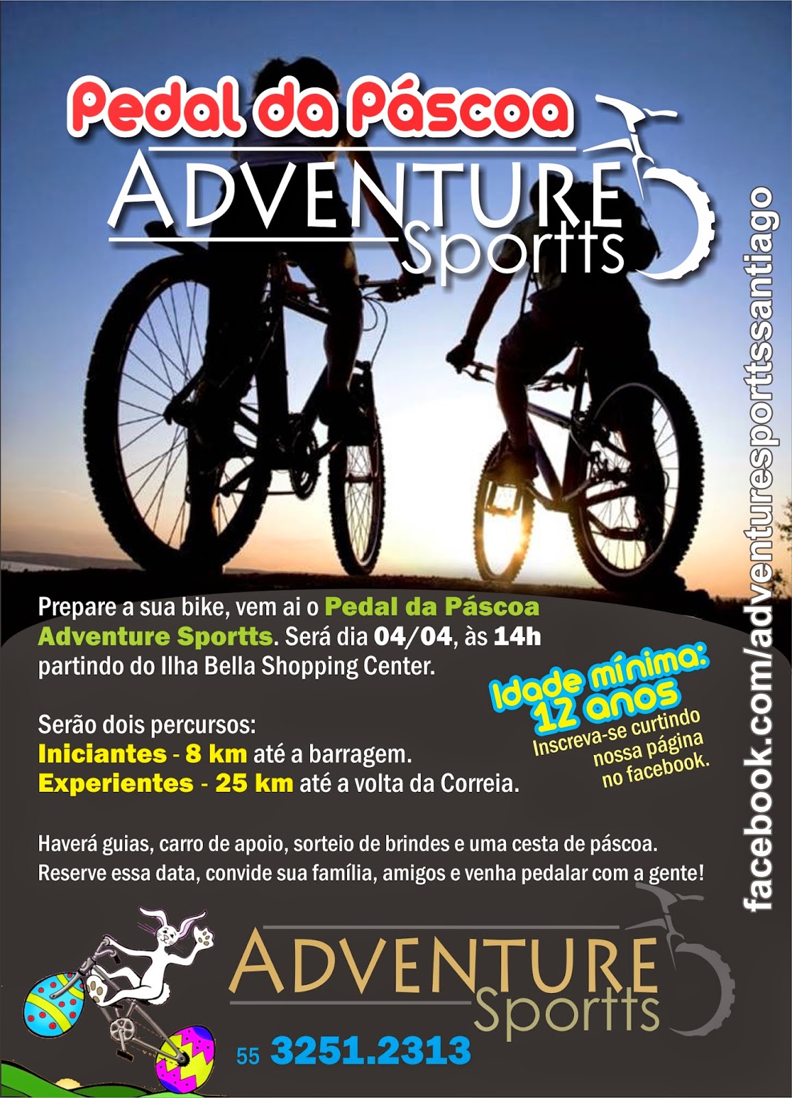 A Adventure Sportts está organizando um passeio ciclístico para este sábado, dia 04 de abril. O encontro será às 14h, em frente ao shopping Ilha Bella, quando serão divulgados os dois trajetos. Um de oito km, até a barragem e outro de 25 km, até a Correia. Os trajetos serão acompanhados por guias e carro de apoio. Os interessados em participar devem ser maiores de 12 anos e basta curtir a página da Adventure no Facebook. Não paga inscrição e será sorteada uma cesta de Páscoa.